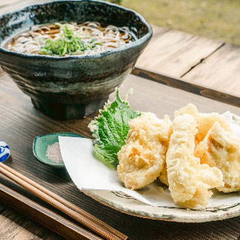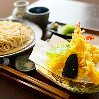 野菜と大ぶりの海老を丁寧に揚げ、風味豊かな蕎麦とともにお召し上がりいただく一皿。つゆの香りとともに、涼やかな味わいをどうぞ。