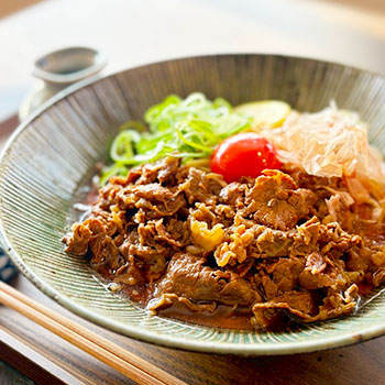 旨みたっぷりの黒毛和牛を、冷たいうどん/そばとともに。特製のかえしをかけて、しっかりとした味わいを涼やかに楽しめる一杯です。