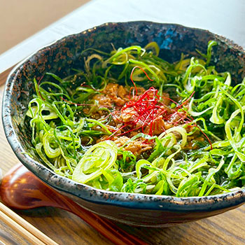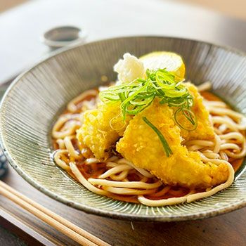 香ばしく揚げた京都産の赤地鶏を冷たいうどん/そばにのせ、ほんのり甘みのある特製かえしをかけてお召し上がり下さい。鶏の旨みとつゆのやさしい甘さが調和する、上品な一杯です。