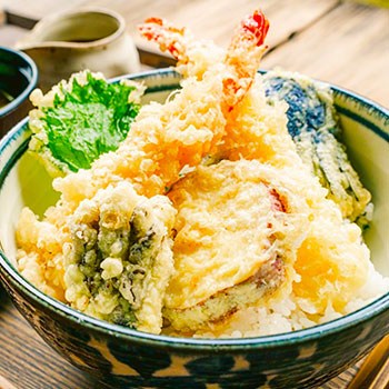 大ぶりの海老と季節の野菜を香ばしく揚げ、ふっくらご飯に盛り付けました。特製の甘めのたれが素材の旨みを引き立てる、満足感のある一杯です。たれをかけてお召し上がりください。