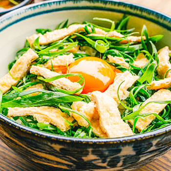 京都・嵯峨の老舗「森嘉」の油揚げを甘く煮含め、香り高い京都産の九条ネギとともにご飯にのせました。卵黄を絡めれば、まろやかな旨みが広がる優しい味わいです。