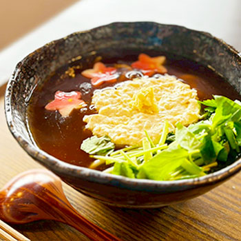 京の風情を感じる、にしんの甘露煮となすの揚げ浸しをトッピングしたうどんとなっております。出汁の香りとともに、ほっとする一杯を。