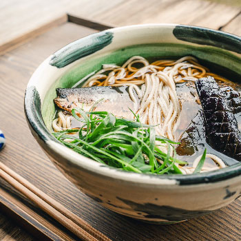 さば節・かつお節・煮干しなどを独自に組み合わせた出汁に、本みりんでまろやかな甘みを添えた特製つゆ。香り高いうどん/蕎麦とともに、素材の奥行きをご堪能ください。
